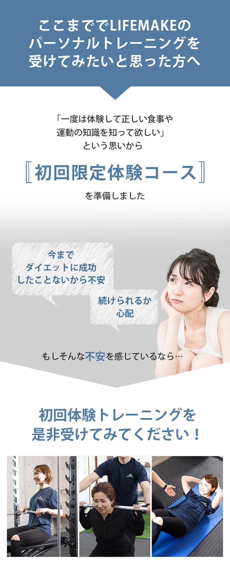LIFEMAKEでは運動経験が全くない方や運動が苦手な方も沢山いらっしゃいます。そのような方にも適切なトレーニングプランを提供しておりますのでご安心ください。