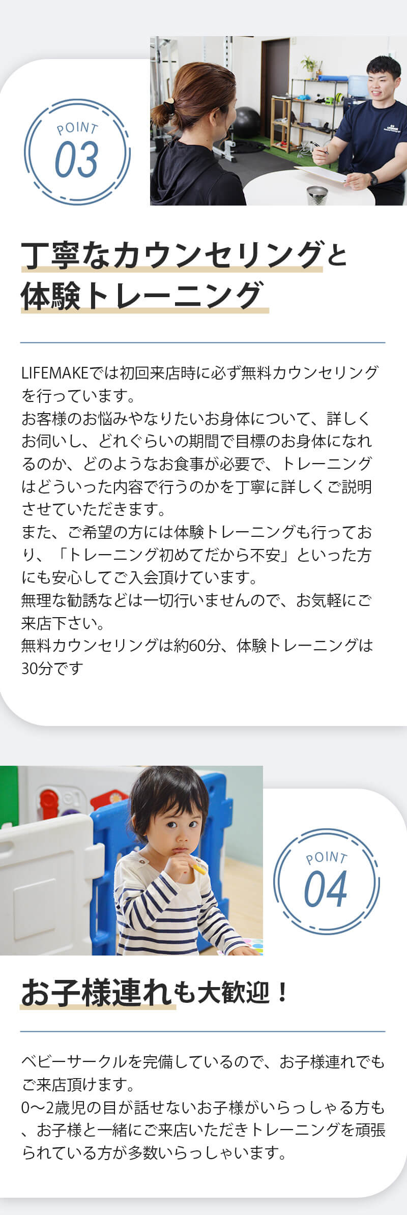 お客様の中にはお子様連れで通われているお客様もいらっしゃいます。全店舗ベビーサークルも完備しております。ご不安な方は無料カウンセリング時にトレーニングフームの雰囲気を実際にご覧になられてみてください。LIFEMAKEはとにかく女性が通いやすいジムを目指しております。安心してご利用ください。