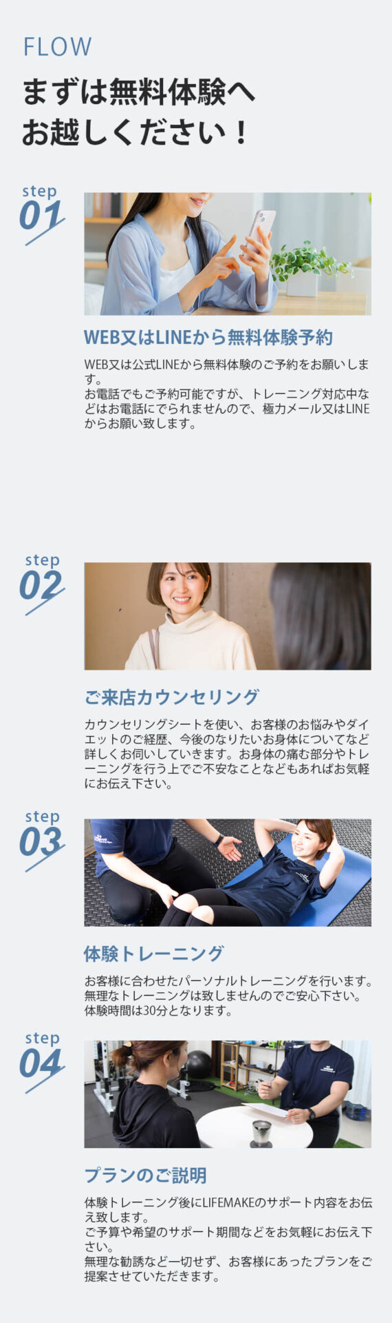 まずは現在のあなたのお悩みをしっかりとお伺いし、そのお悩みをLIFEMAKEがどのように解決をできるかということをご提案させていただきます。「何をやっても痩せない」「お腹周りが気になる」などなかなか人に言えない悩みもあるかと思いますが、個室にて1対1でお悩みをお伺いしますので安心してご相談くださいませ。