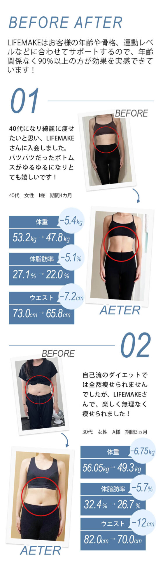 LIFEMAKEではあなたが思う「理想的な体形」になるよう個人に合わせたトレーニングプログラムを組みますのでご安心ください。ダイエットの目的の場合は基礎代謝を上げる為の適度な筋肉を付ける筋力トレーニングを行っております。もちろんムキムキになりたいなどのご要望もありましたらご対応させていただきます。「このような体形になりたい!」など、ご希望・目標がございましたら無料カウンセリングの際にご提示くださいませ。