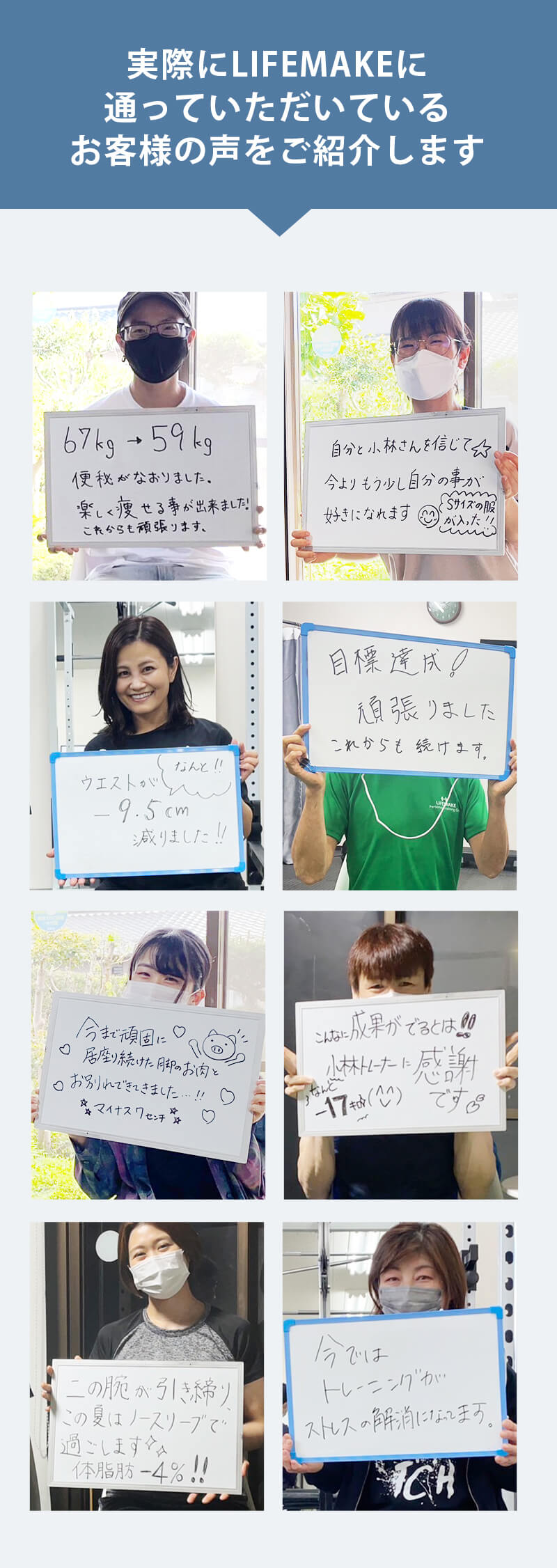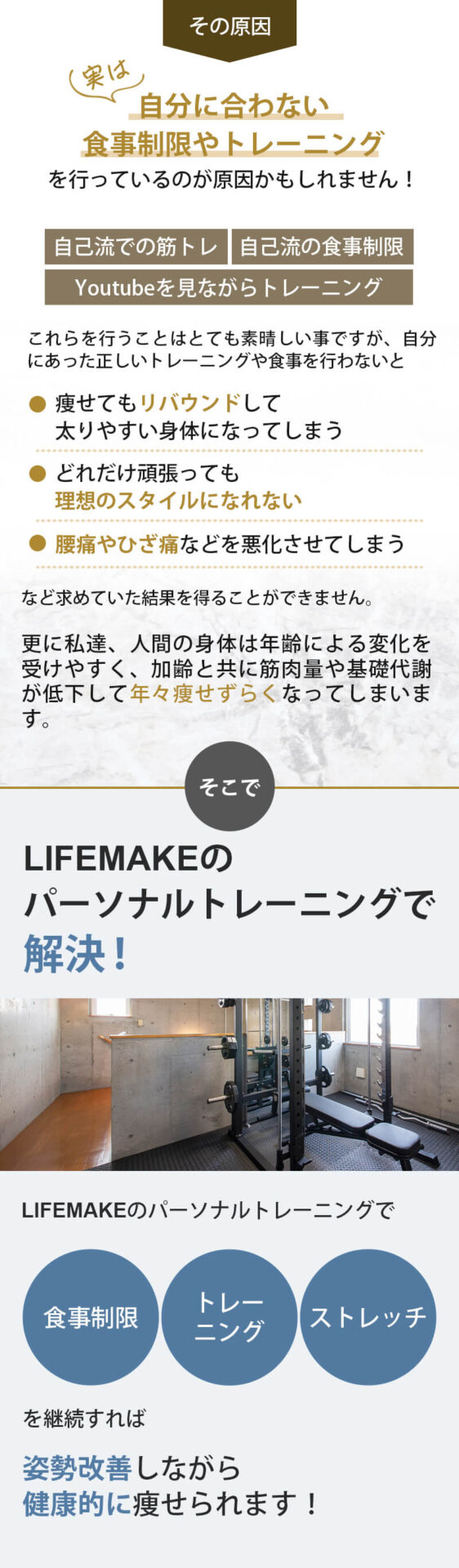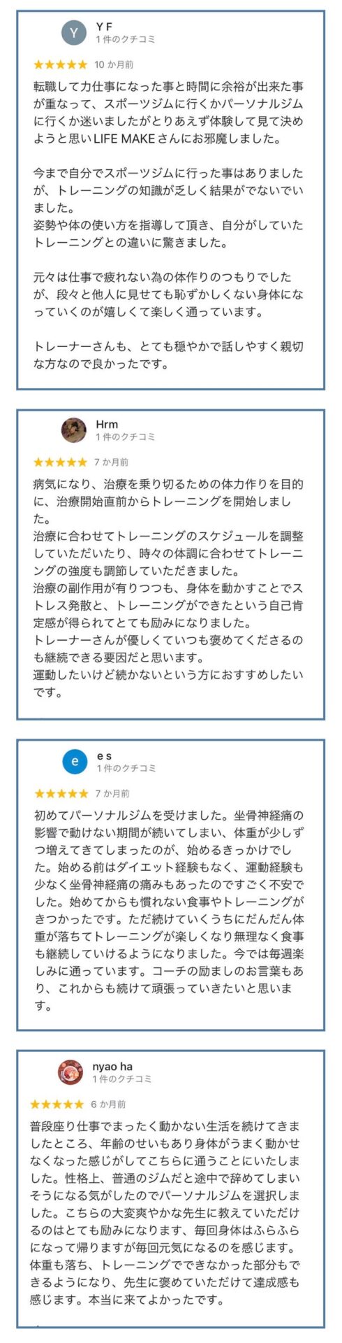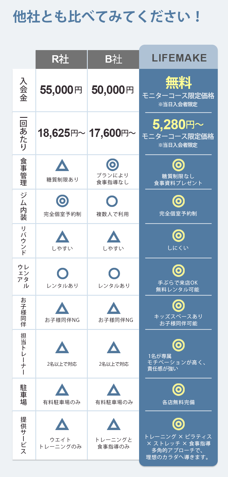 他社様も素晴らしいサービスを提供しており、比べるのはなかなか酷なことではございますが、LIFEMAKEでは「通いやすい空間・店舗づくり」「LINEの手厚いサポート」「糖質制限しない食事指導」「丁寧で優しいトレーニング指導」「トレーナーは全員指導経験豊富なプロトレーナー」という点が他社様とは全く違います。ご検討の参考にしていただけますと幸いです。