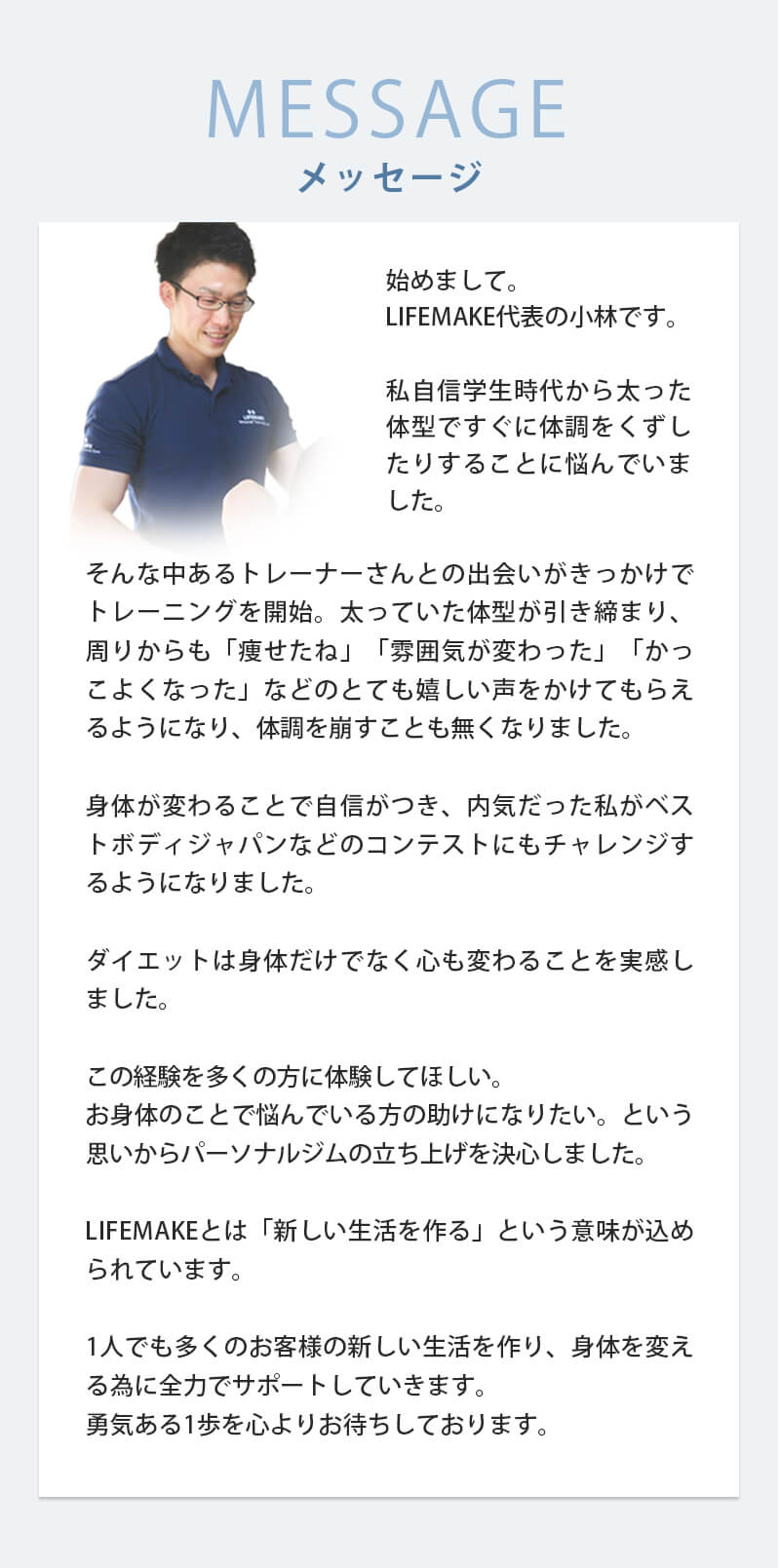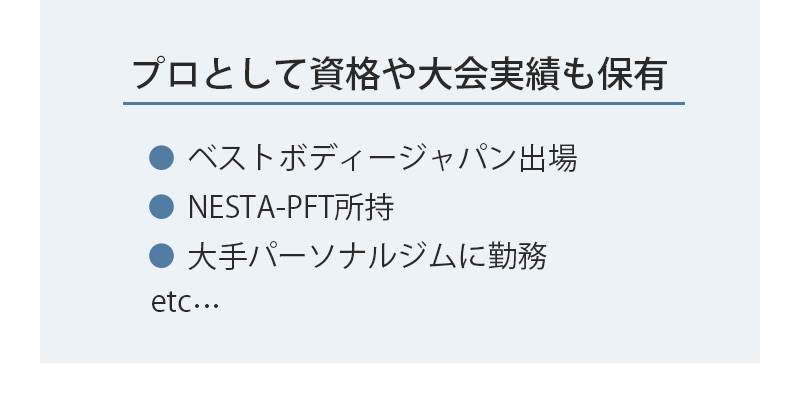 LIFEMAKEではベストボディジャパンやフィジークなどのコンテスト出場経験者も在籍しておりますので、身体に負担をかけずに増量するための食事や、筋肉が無い方でも安心して取り組める筋トレメニューのご提案も得意です。是非お気軽にご相談ください。