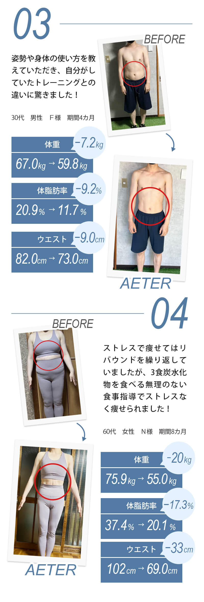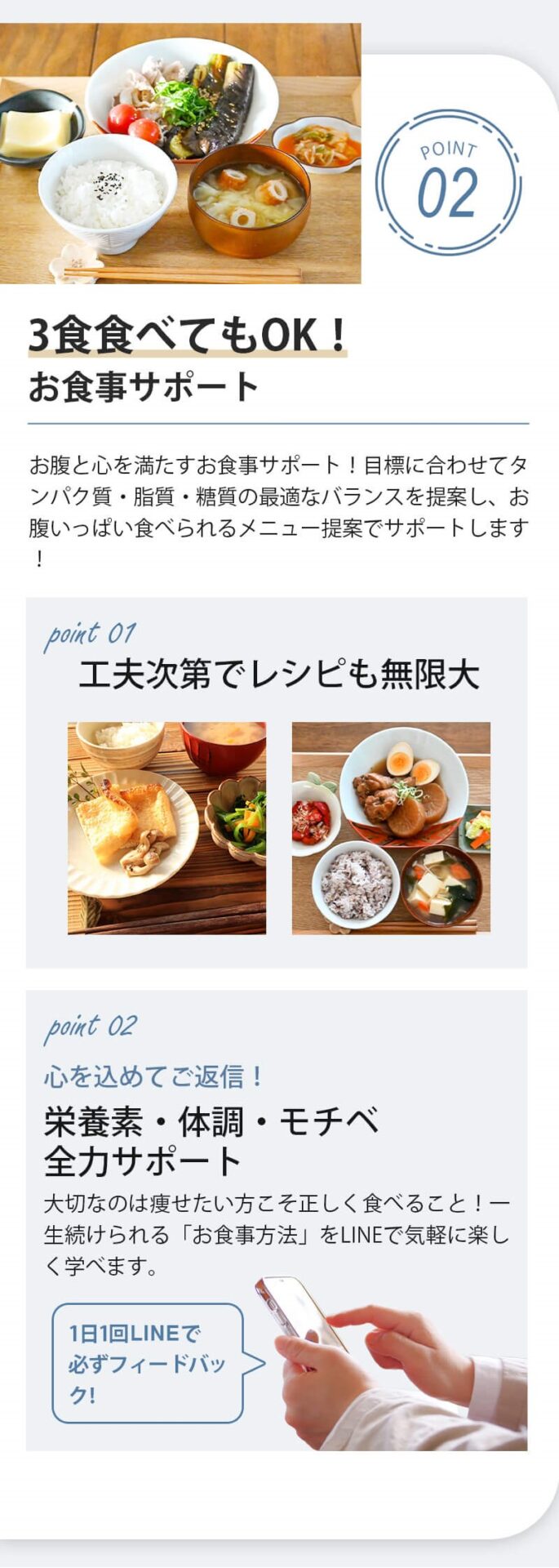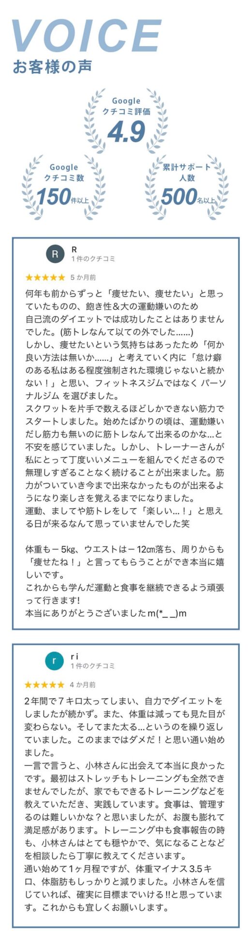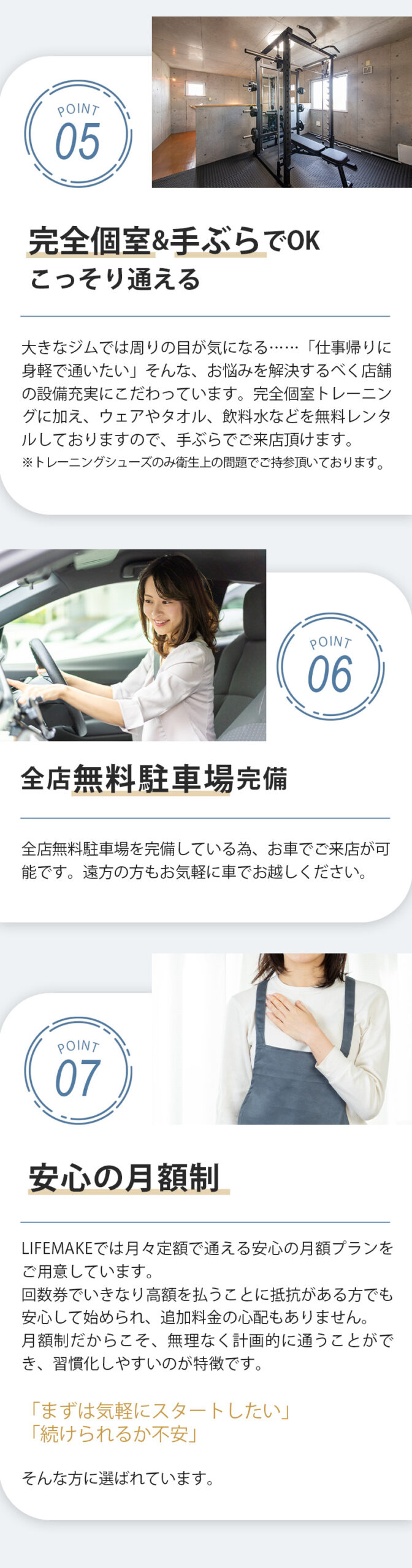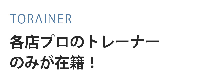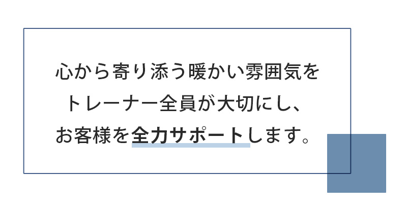 A、『人目を気にせず通える店舗づくり』『LINEn手厚いサポート』『糖質制限しない食事指導』『トレーナーは全員指導経験豊富』『優しく丁寧なトレーニング指導』
