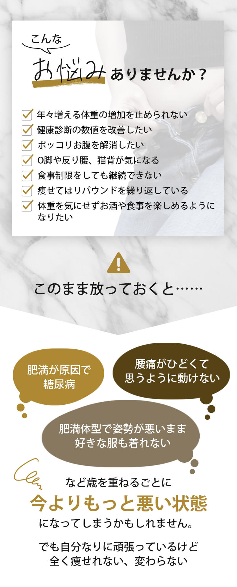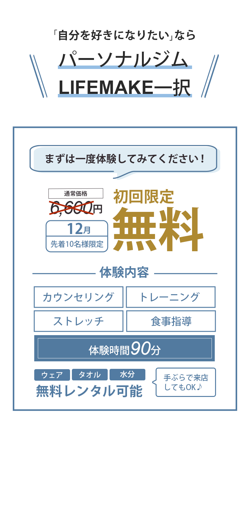痩せたい、身体を変えたいという気持ちと現在のお悩みをご持参ください。LIFEMAKEのトレーナーがしっかりと解決へと導きます。