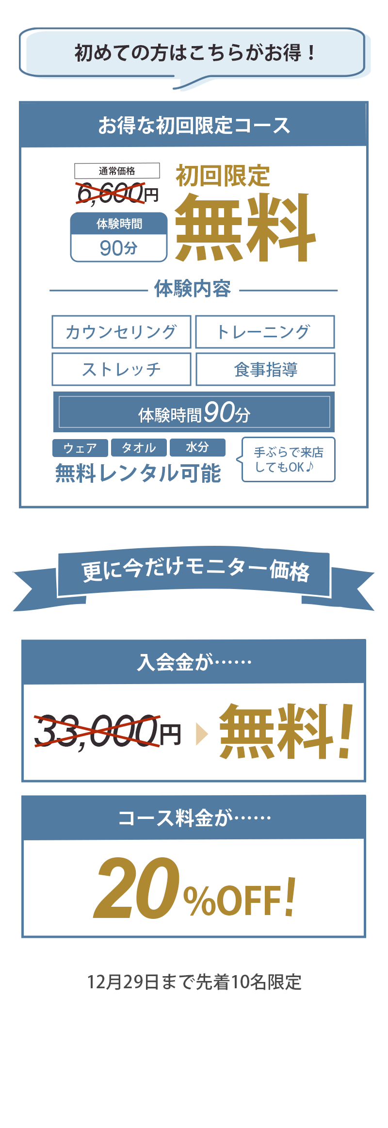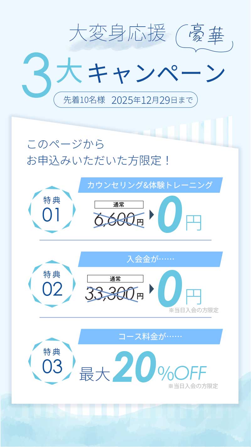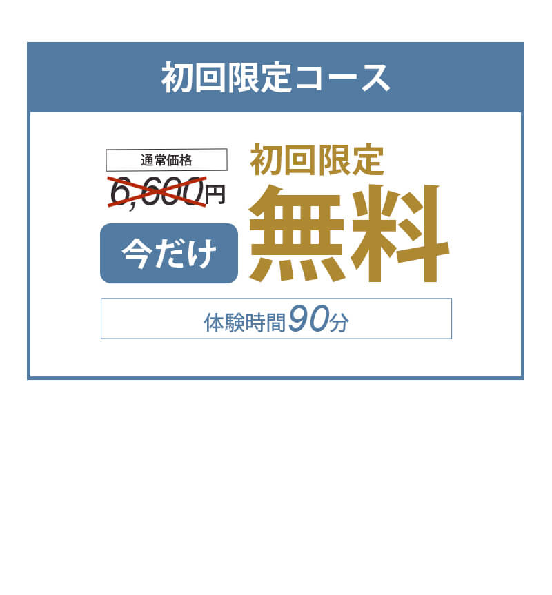 今回は【期間限定】の特別企画につき、コース料金の割引に加えて《入会金・体験料金も無料》となる、非常にお得なプランです。