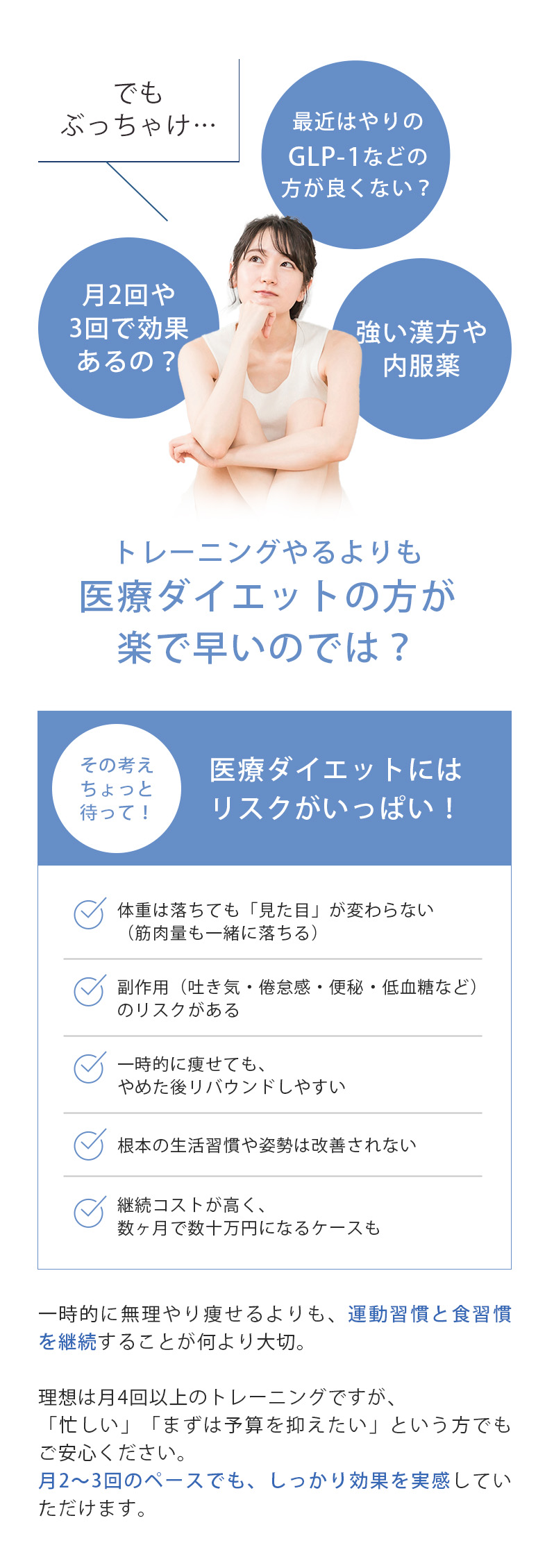 A、ご心配なく。あなたが思う「理想な体形」になるよう個人に合わせたトレーナニングプログラムをご提案します。