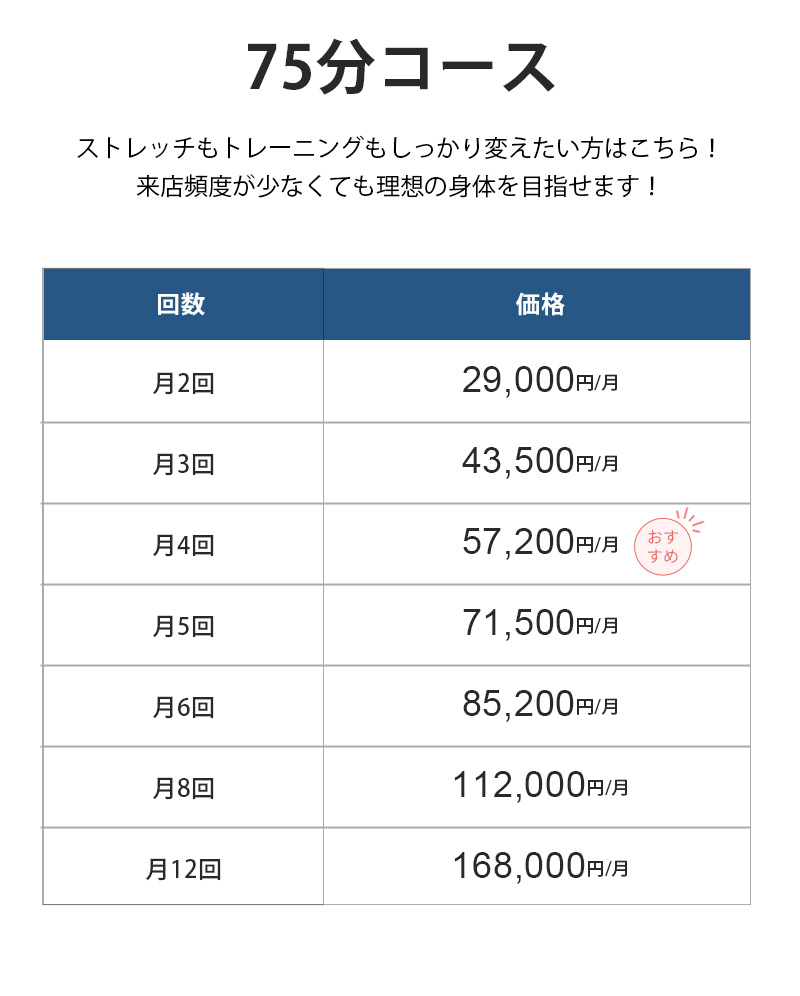 お客様の運動習慣によって種目や強度を調整しますので無理の無い範囲かつ、最大限の効果がでるようにしっかりサポートさせていただきます。