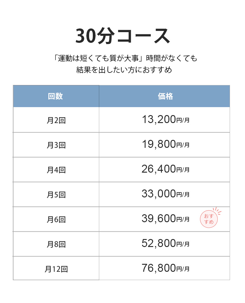 最初にお悩みや目標、運動経験をヒアリング致しまして、トレーナーが種目を組み立てます。30分ほどのトレーニングにて、自己流との違いをしっかりと感じていただけると思います。